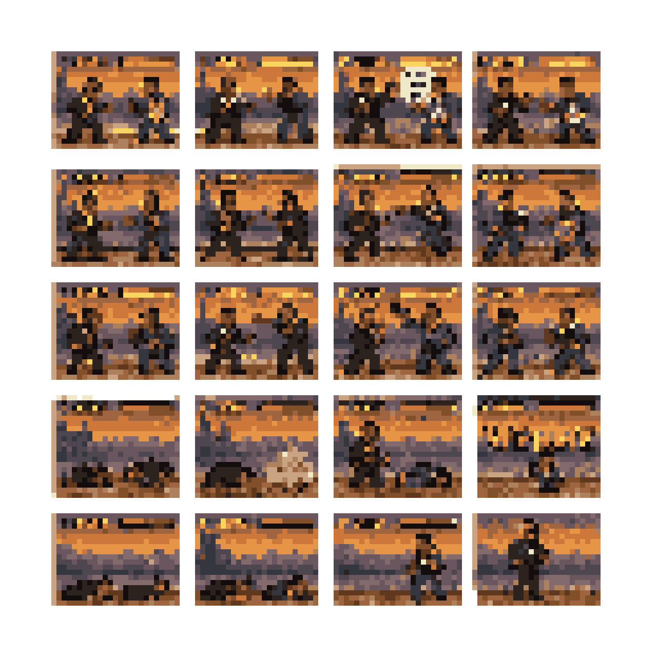 16-bit pixel art sprite sheet for Street Fighter-style fight: P Diddy (black suit, gold chains) vs Barack Obama (blue su...