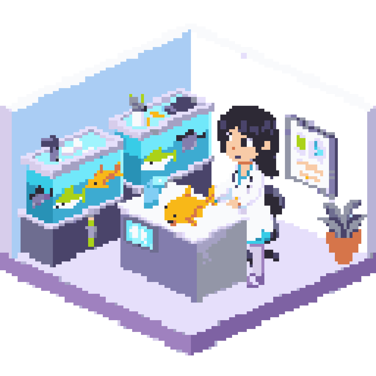 A cozy and colorful 2D mobile game scene inside a modern aquarium veterinary and caretaker station. Soft pastel colors,...