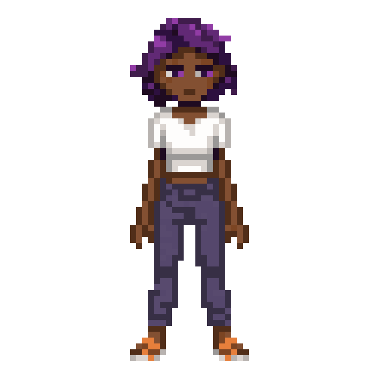 african american woman villager with purple hair wearing a tshirt and pants and sandals