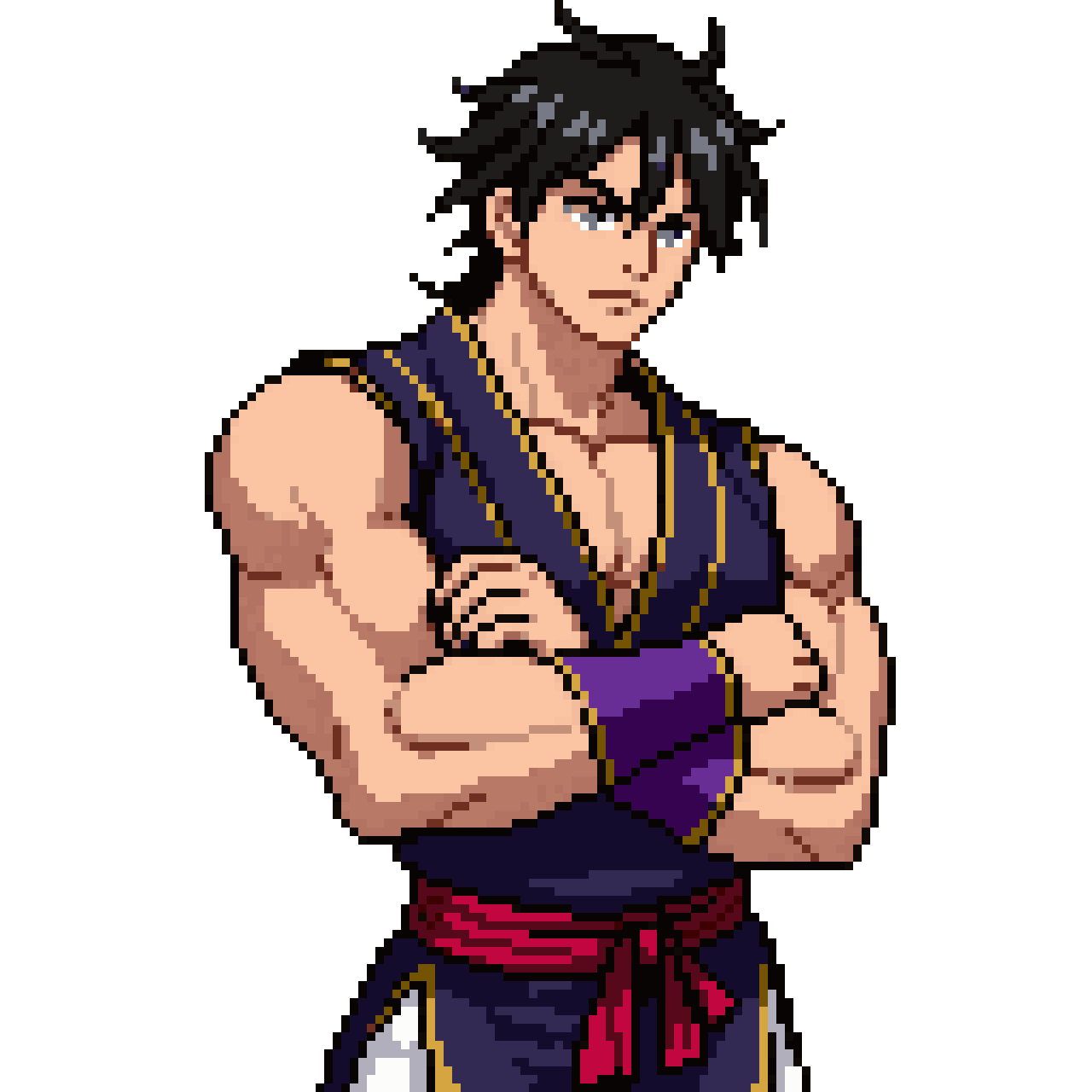 A muscular anime male fighter, balanced build, calm expression with slight smile, black hair with red highlights, confi...