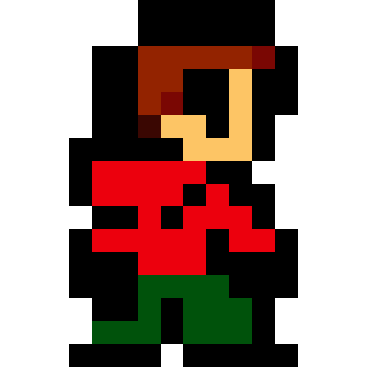 Boy with red hoodie,green pants,brown hair,yellow eyes 16x16,standing facing slightly to the right hands are black glove...