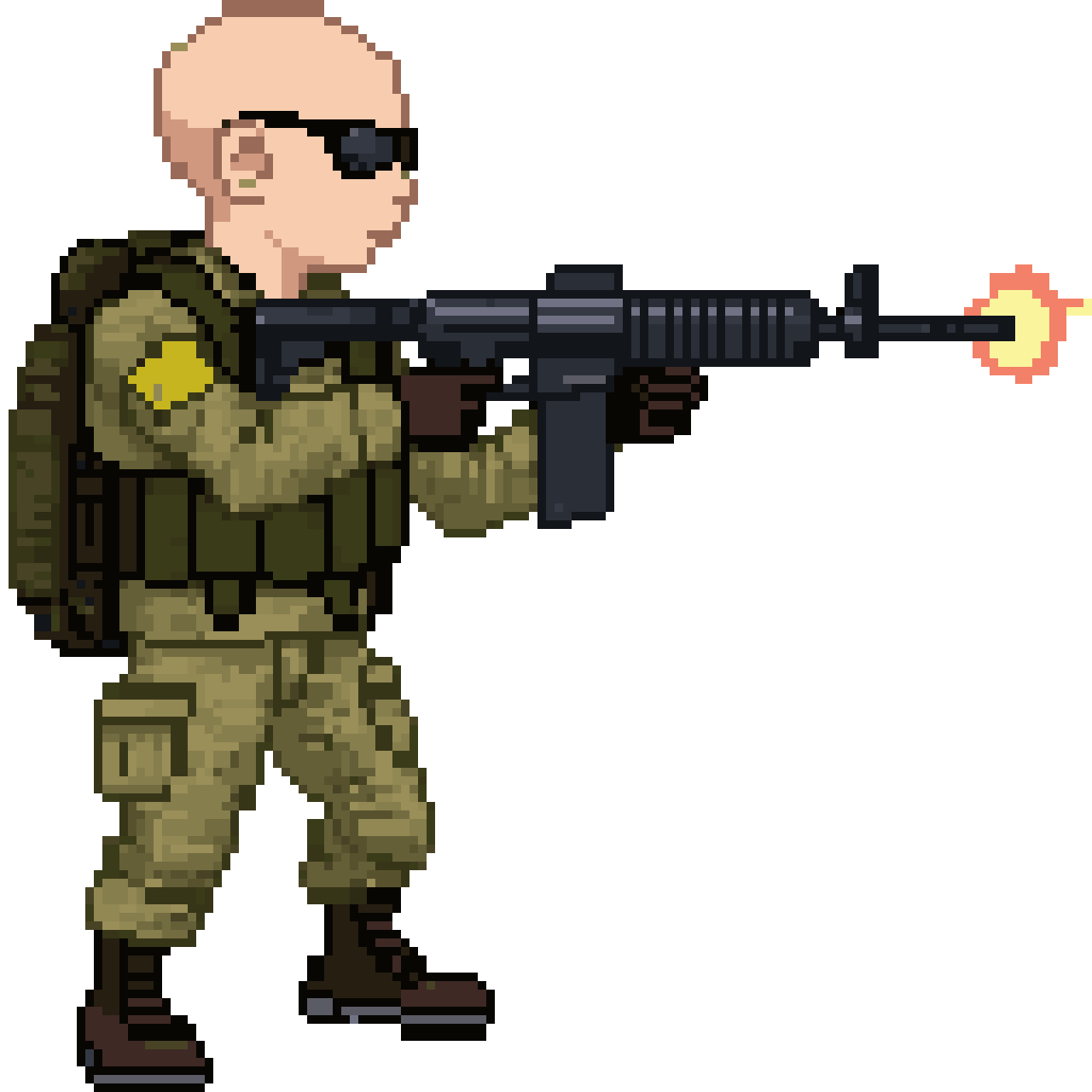 dessine moi un militaire en vue de profile en tirant avec une mitraillette. Habillé en treilli et chauve.