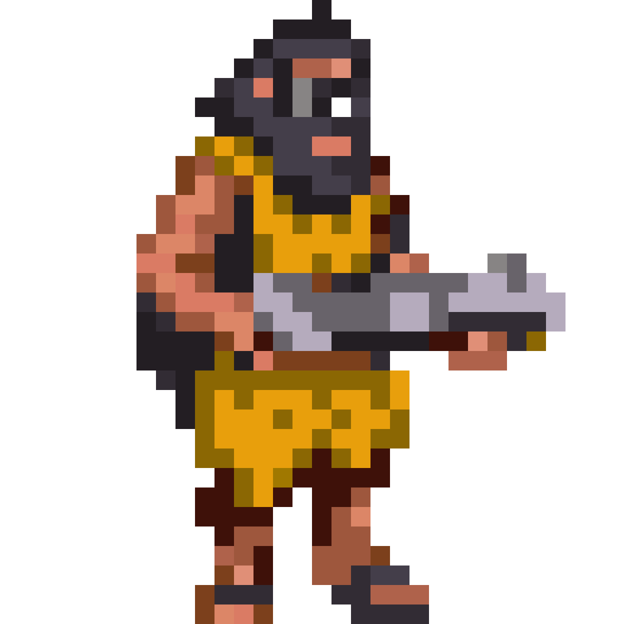 caveman character, side view facing right, hunched posture, large messy dark hair, thick dark beard, wearing yellow anim...