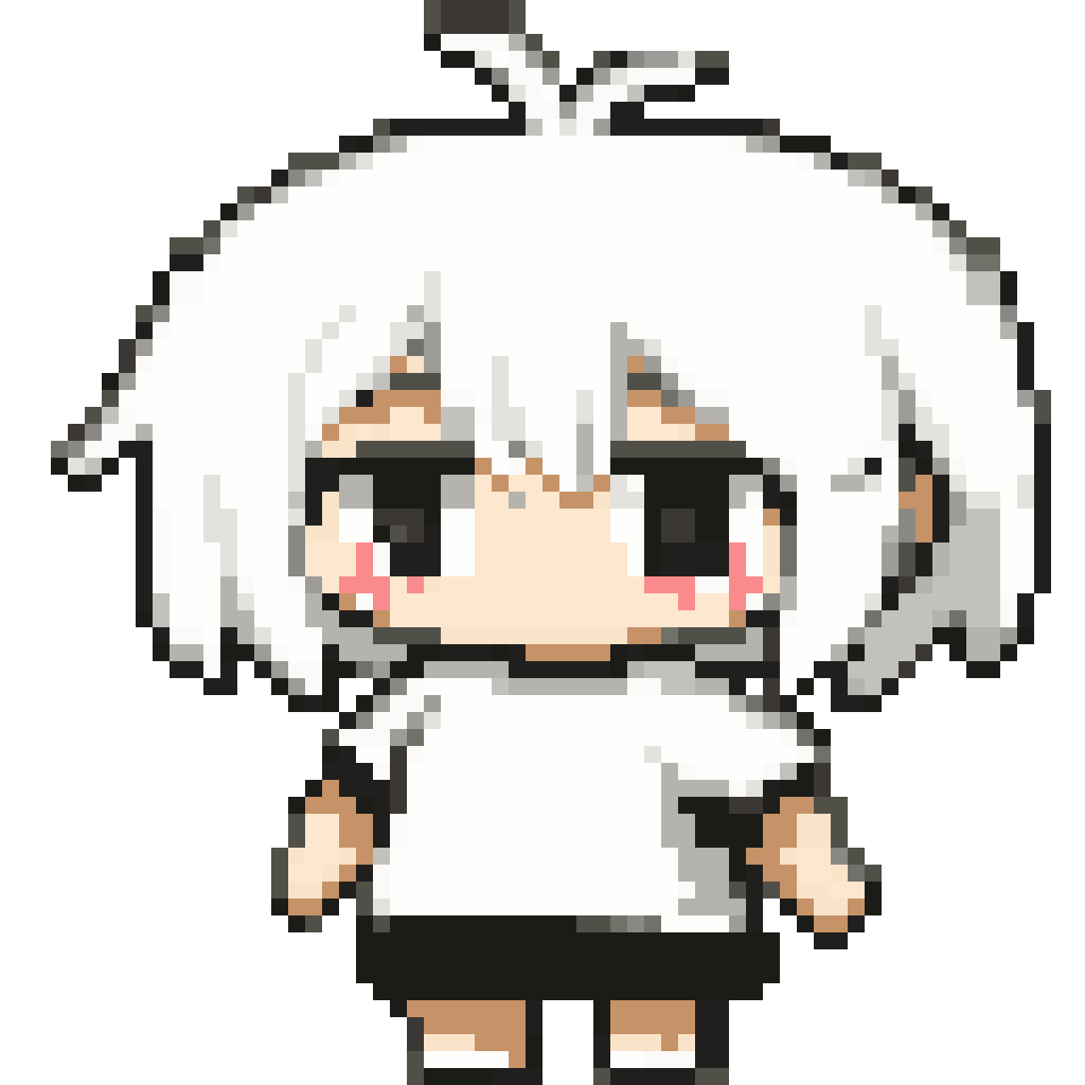 chibi anime girl, white hair, two hair buns on top, large black eyes (solid black pupils), white t-shirt, black shorts, ...