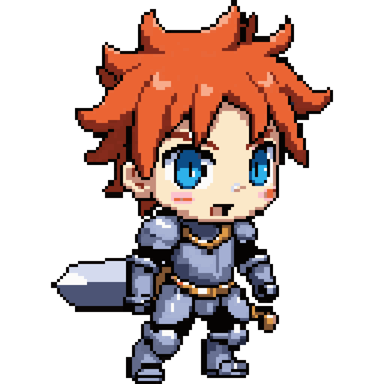 "Chibi anime boy, orange spiky ponytail, silver knight armor, large sword, side-view sprite, 2D game character, MapleSto...