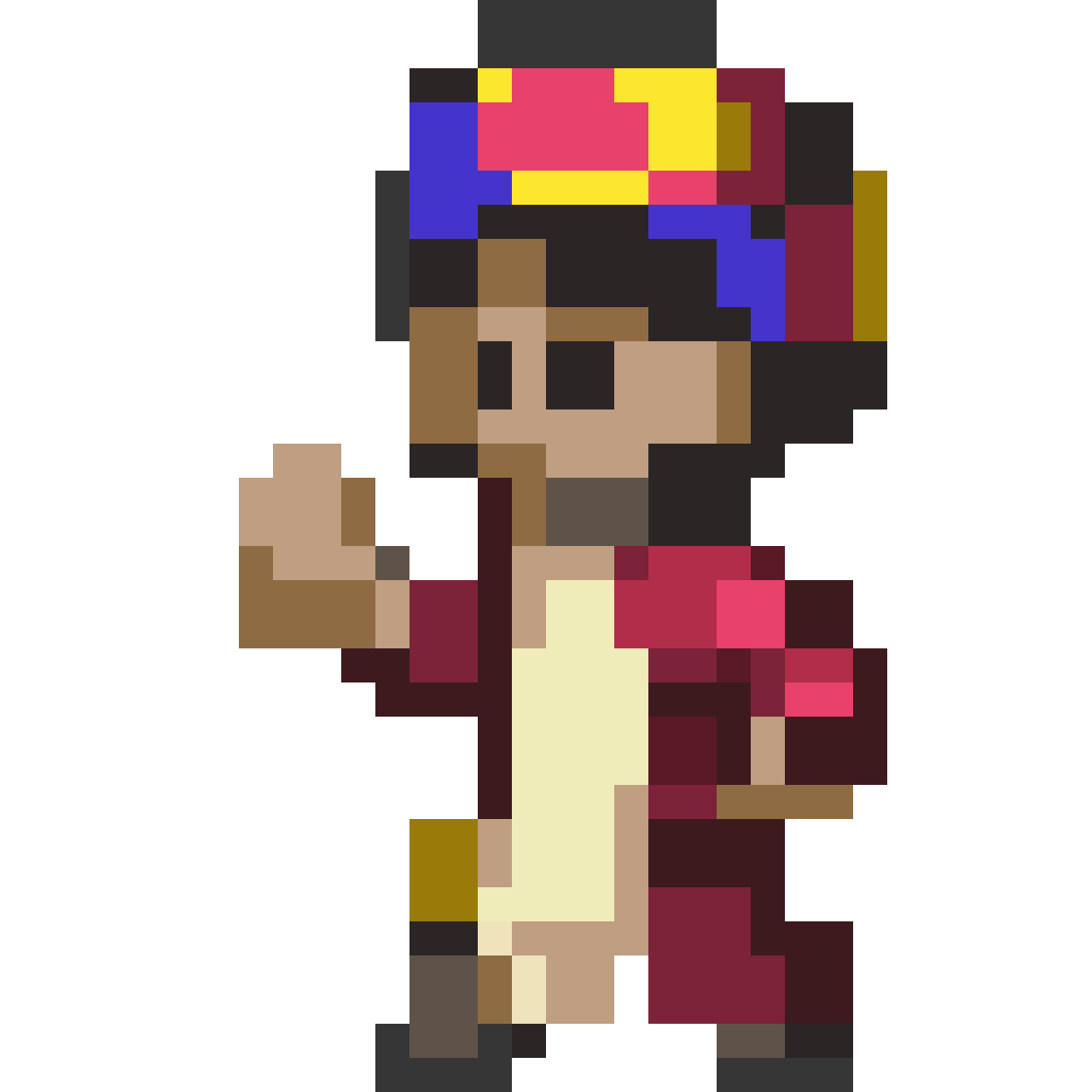 top-down RPG sprite, chibi arab merchant, turban, robe, walking pose, 32x32, tileset style, SNES palette, no anti-aliasi...
