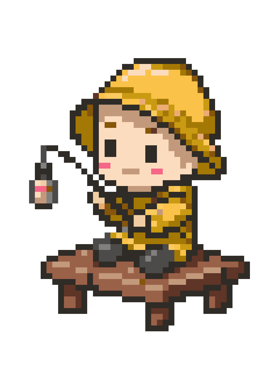 Chibi-style 16-bit pixel art of a tiny cute fisherman. Flat 2D side-scroller profile view. Large rounded head with a yel...