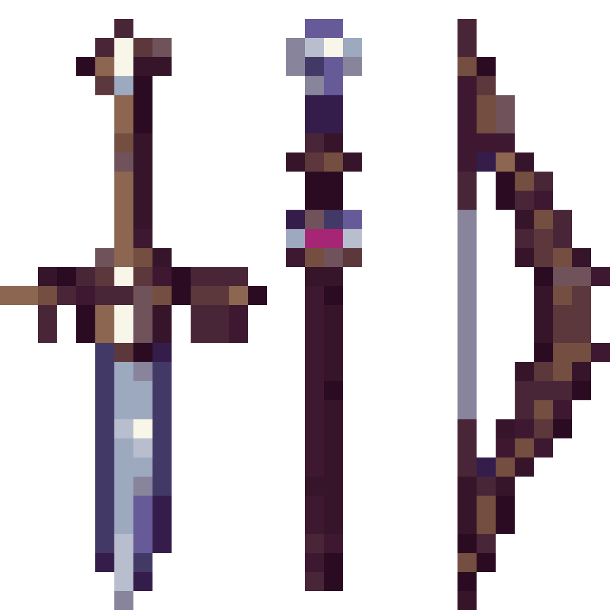 generate me some swords, staffs, bows for my 2d pixelated roguelike game