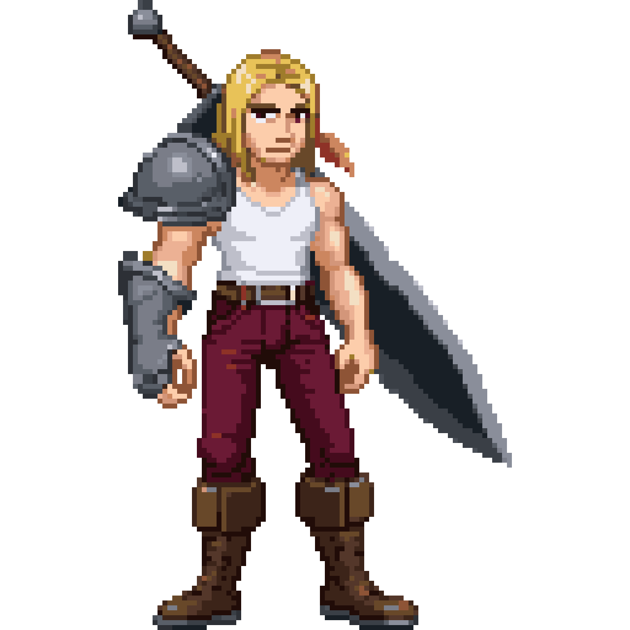 A muscular blond male character with a middle-part hairstyle, brown eyes, confident stance. He wears a white tank top, h...