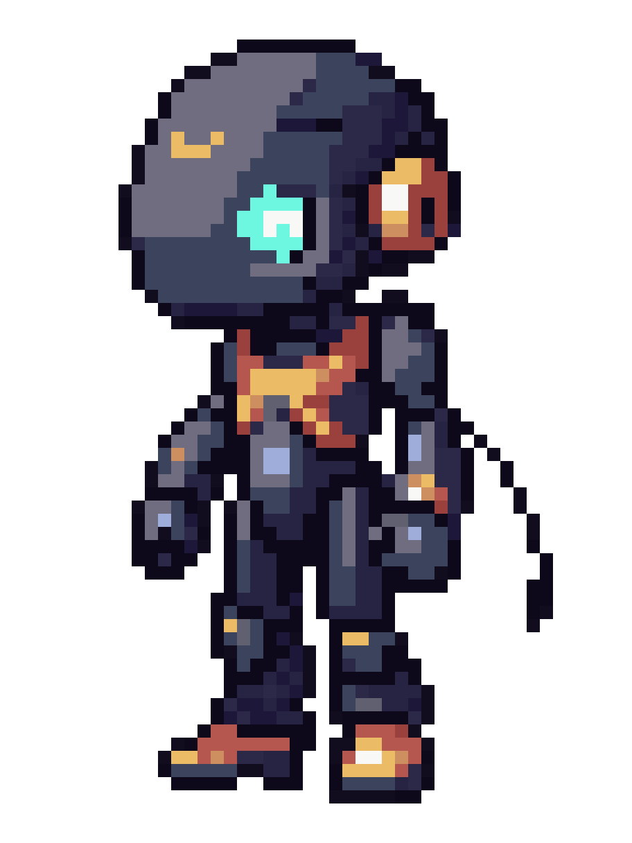 small maintenance daemon inside a broken computer-machine world, cyan diagnostic glow, compact humanoid silhouette with ...