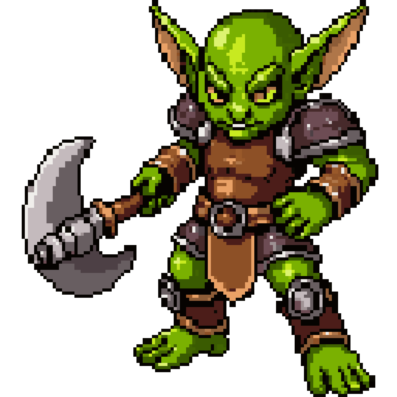 detailed green goblin, holding a battle axe, fantasy creature, muscular small body, large ears, glowing eyes, wearing de...