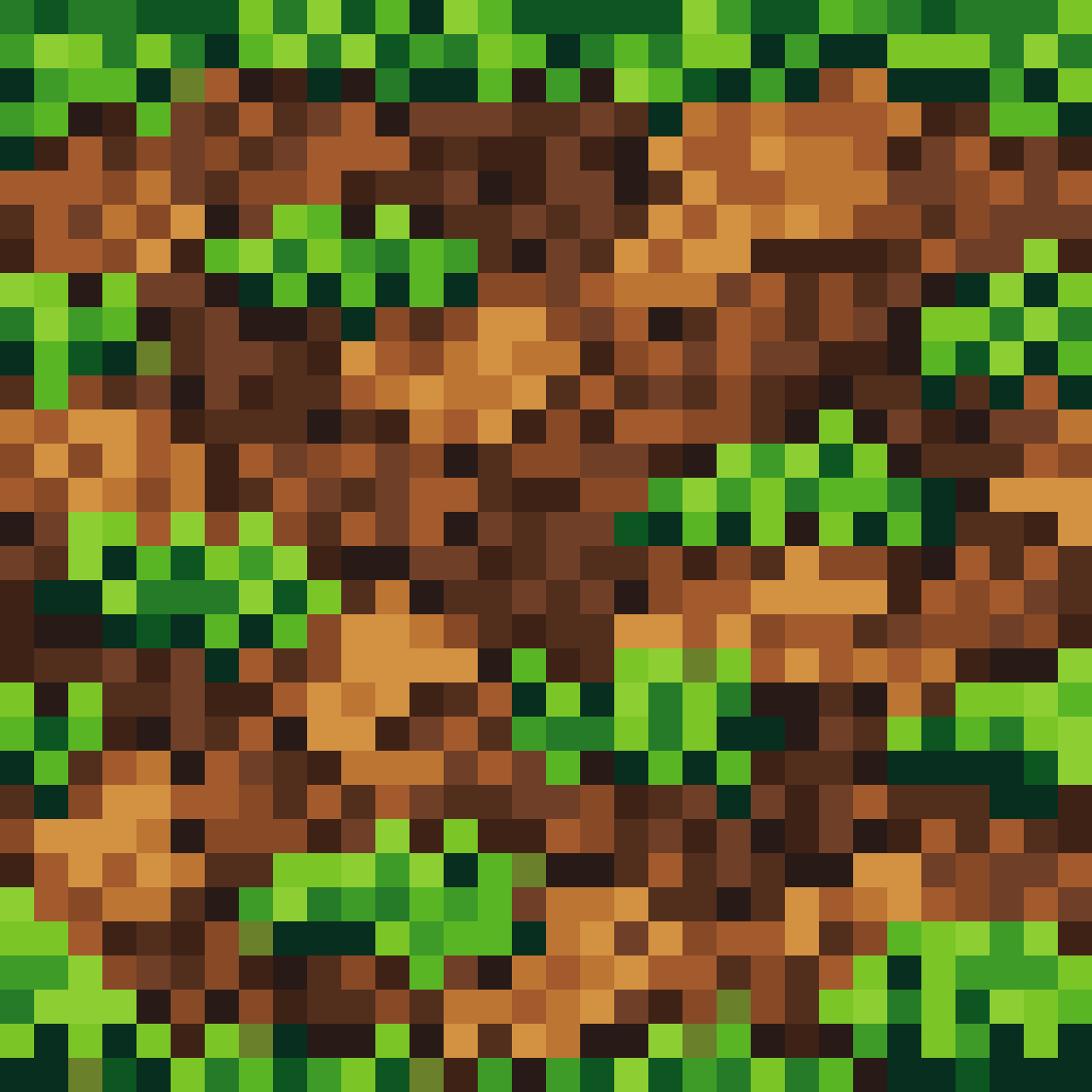 a 32x32 pixel art tile of dirt with a grass top, the dirt is patchwork of brown and the grass is green.