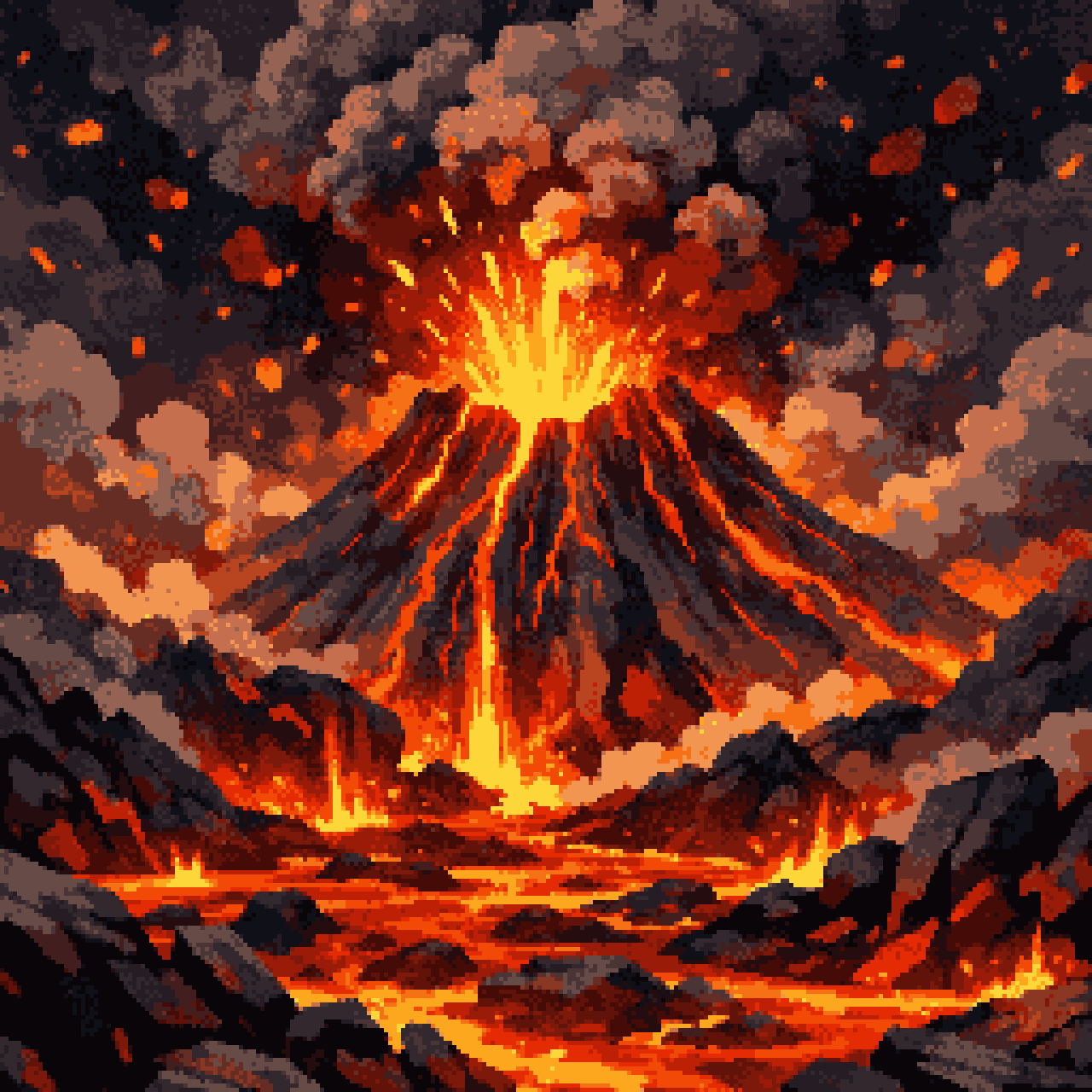 Create a background for a Scratch game set in a volcano environment. The volcano should be large and erupting, placed in...