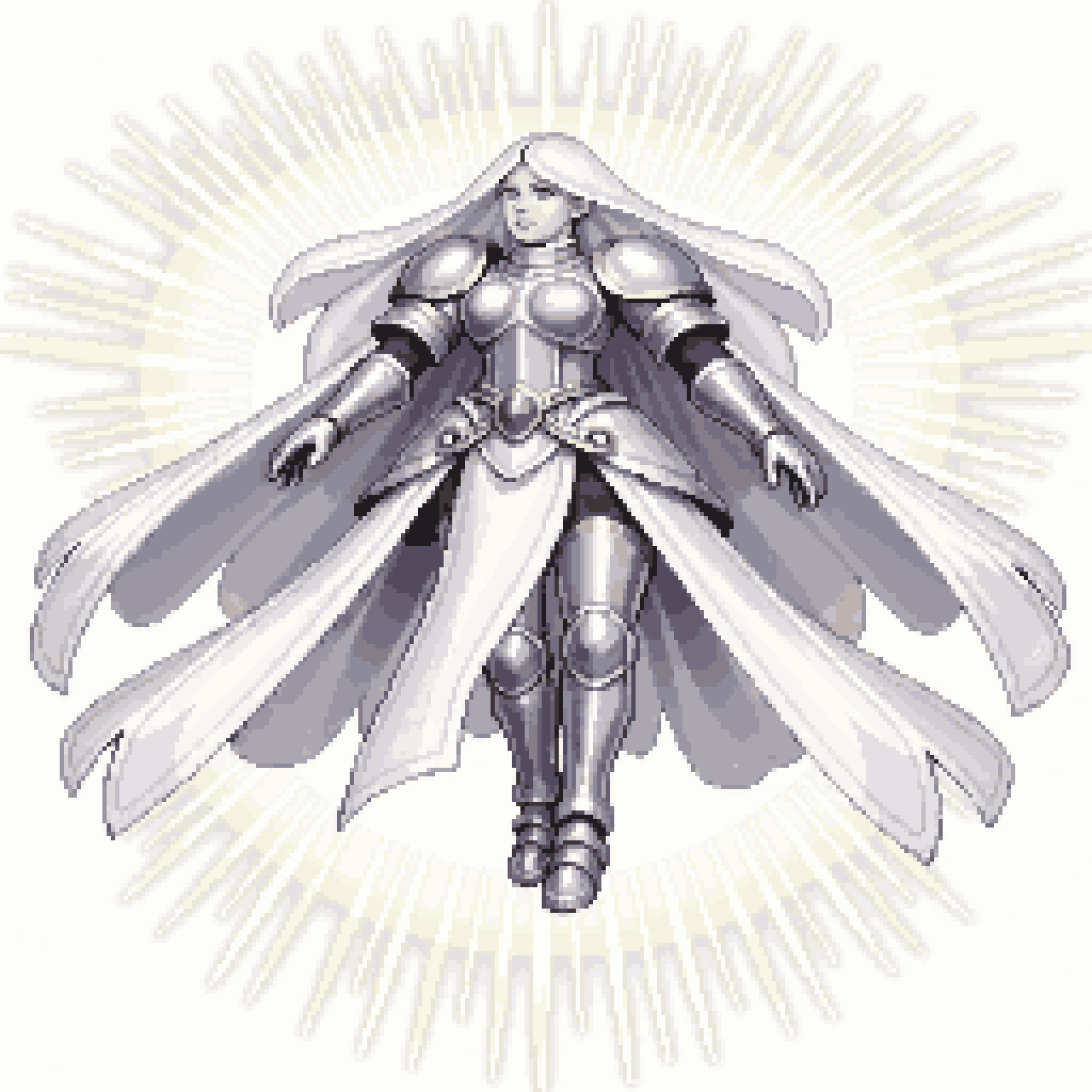 Ethereal god-like female medieval Saintess, pure white hair and eyes glowing with divine white light, wearing impenetrab...