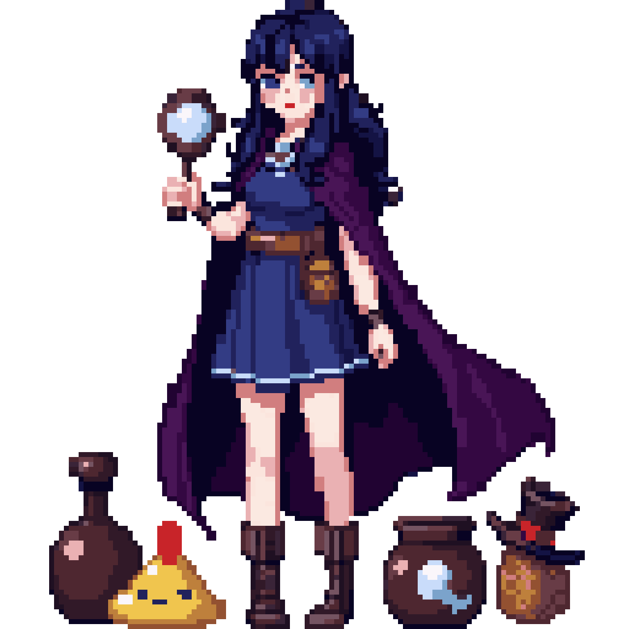 create a beautiful girl for a fantasy based rpg who has long dark blue hair and is a little tough, she likes to research...