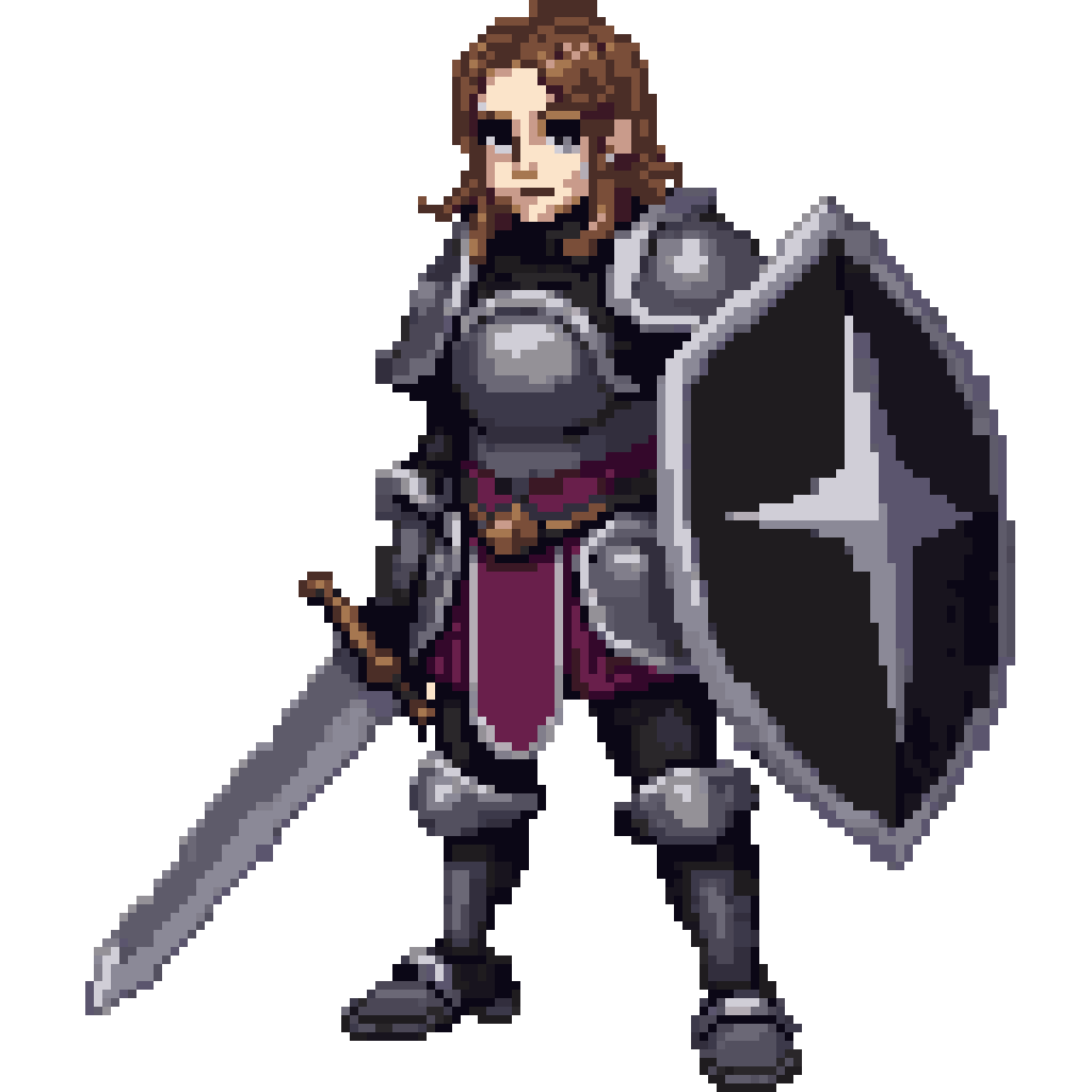 Создай 2д спрайт девушки паладина для файтинга mugen. Девушка должна быть одета в тяжелые латные доспехи без шлема, но и...