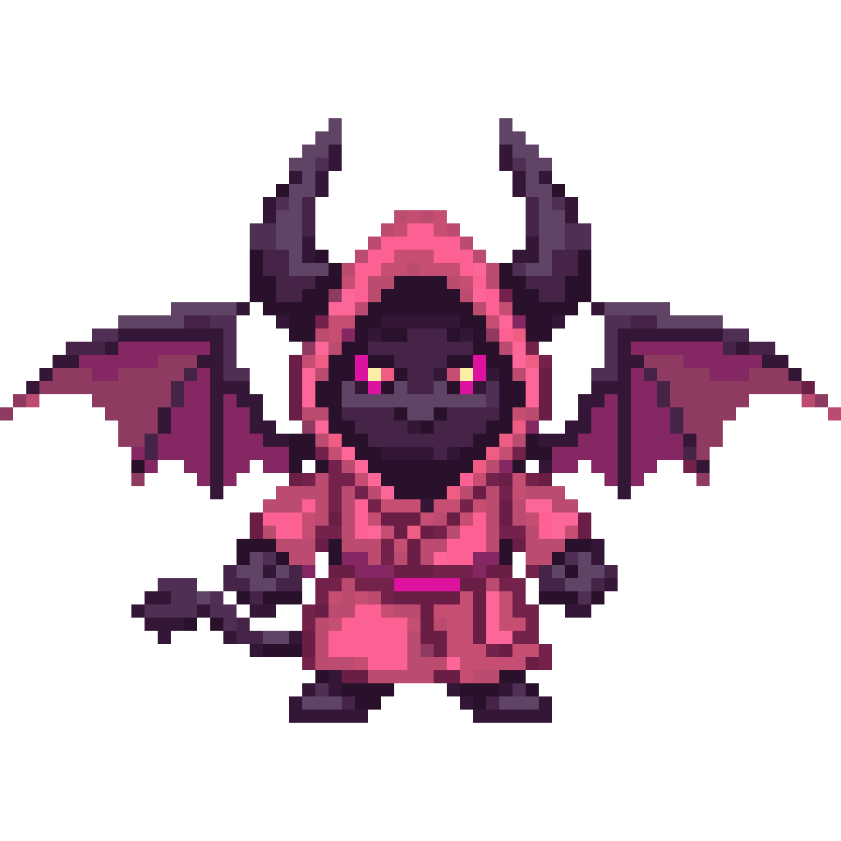 pixel art demon father, cozy cartoon style, 2D side view, small horns, large wings, glowing red eyes, pink bathrobe, fri...