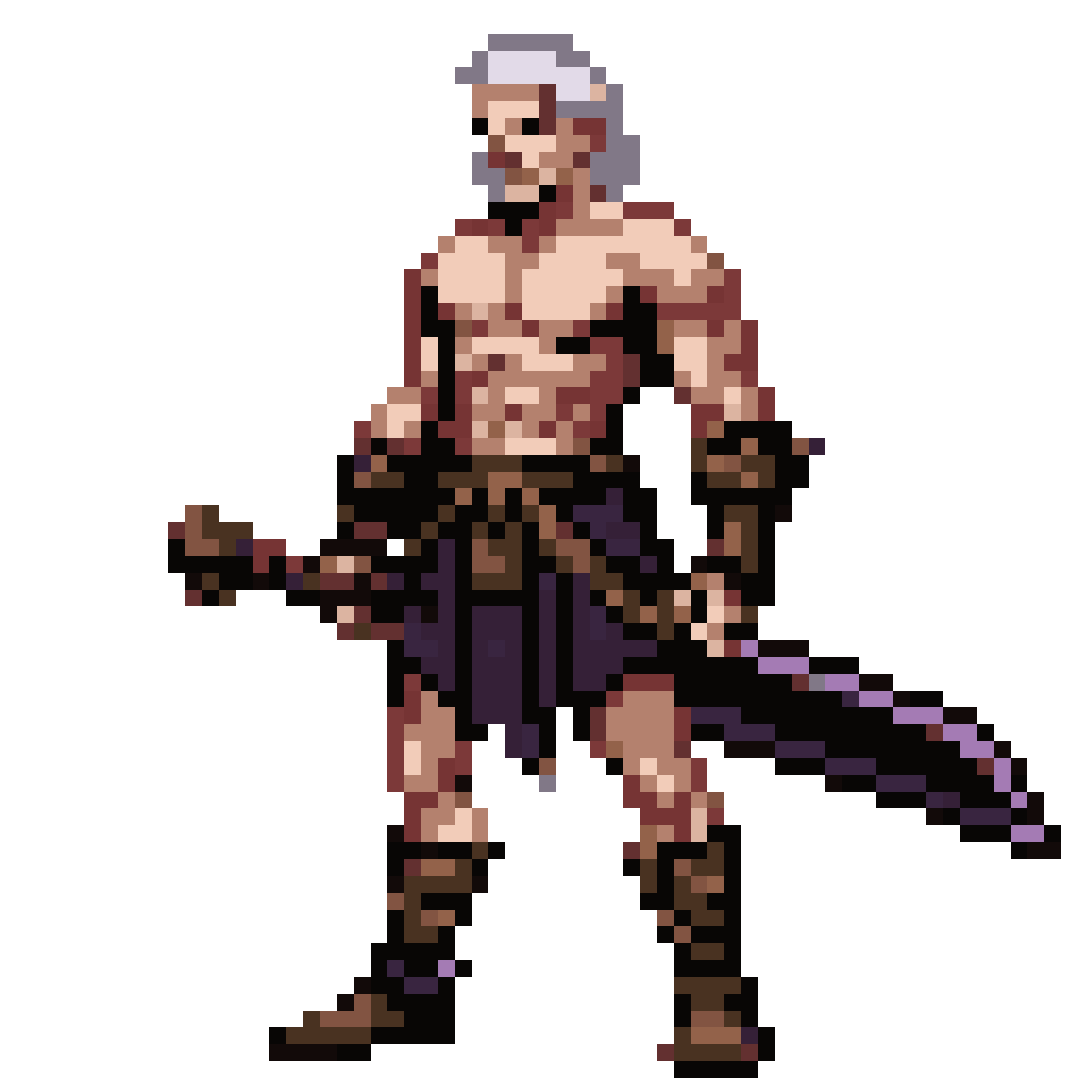 a shirtless man, with white hair, dragging a large sword behind him with his right hand wearing a gladiator gauntlet
