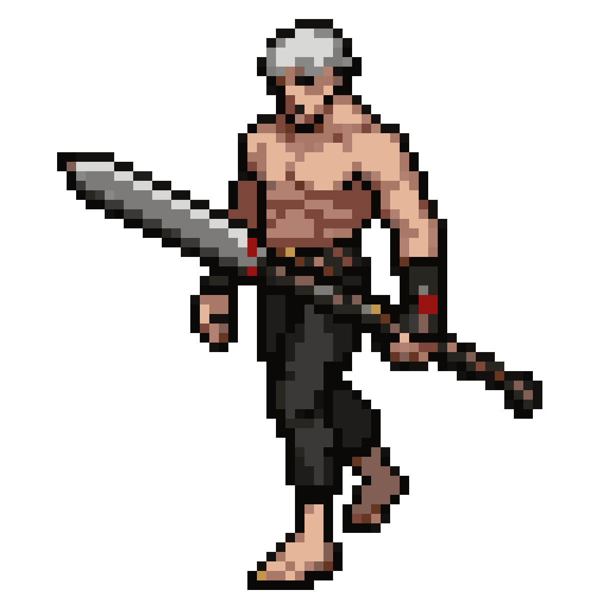 a shirtless man, with white hair, dragging a large sword behind him with his right hand wearing a gladiator gauntlet. He...