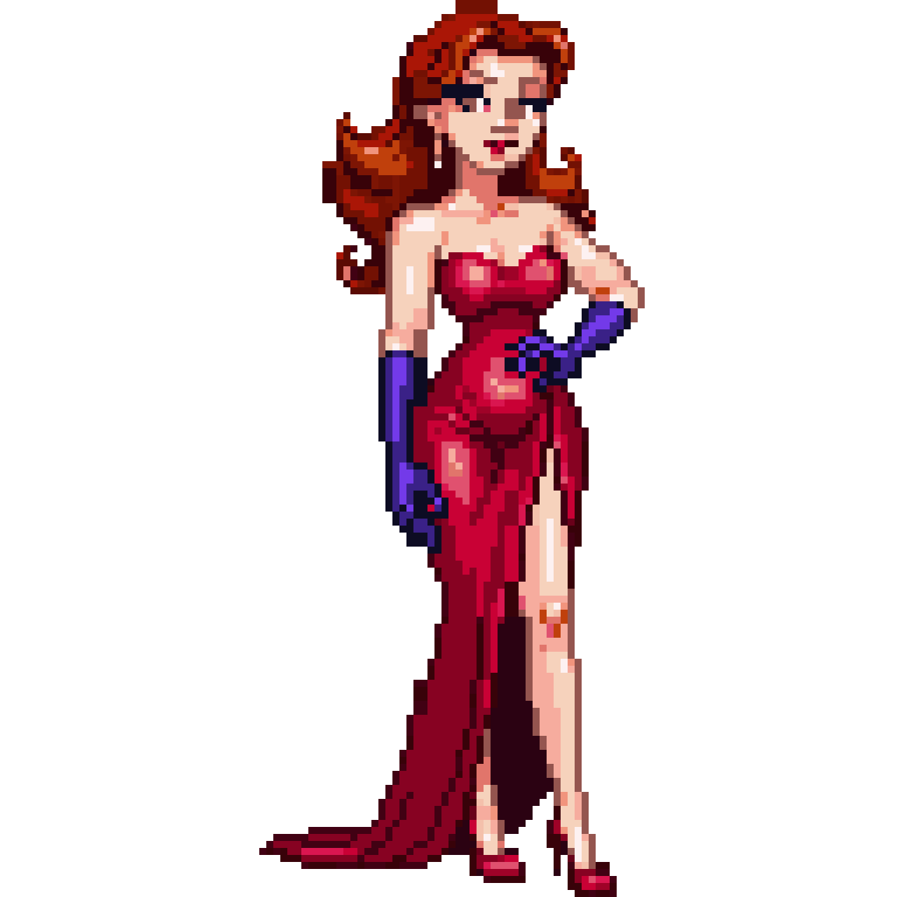 A glamorous, curvy woman with an exaggerated hourglass figure. She has long, voluminous red hair styled in soft waves th...