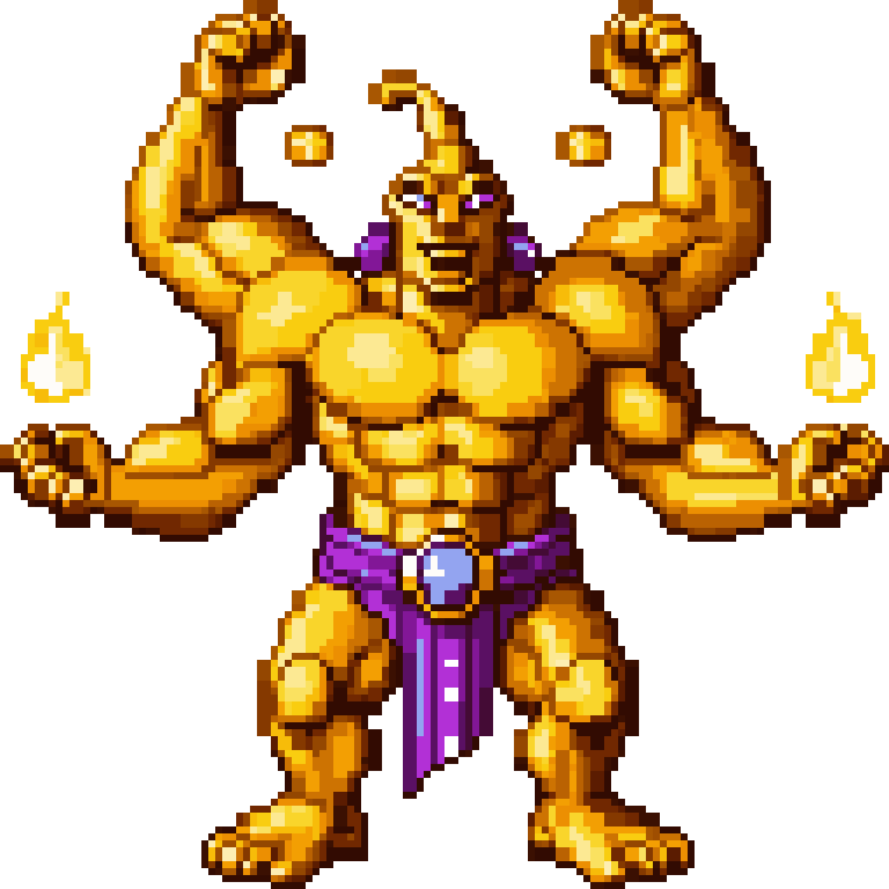 A genie, made out of gold, 4 arms flexing, gold orbs floating around, Fantasy jrpg style, front view.