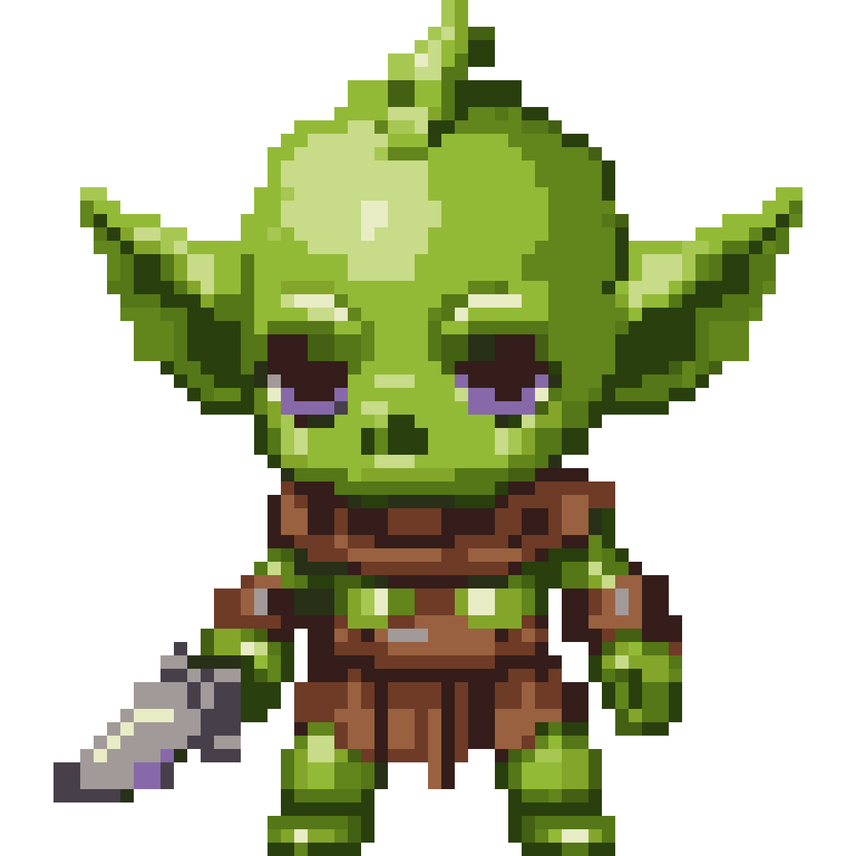 32x32 pixel art sprite, top-down view (hotline miami style), small goblin, green skin, big head, large pointed ears, bro...