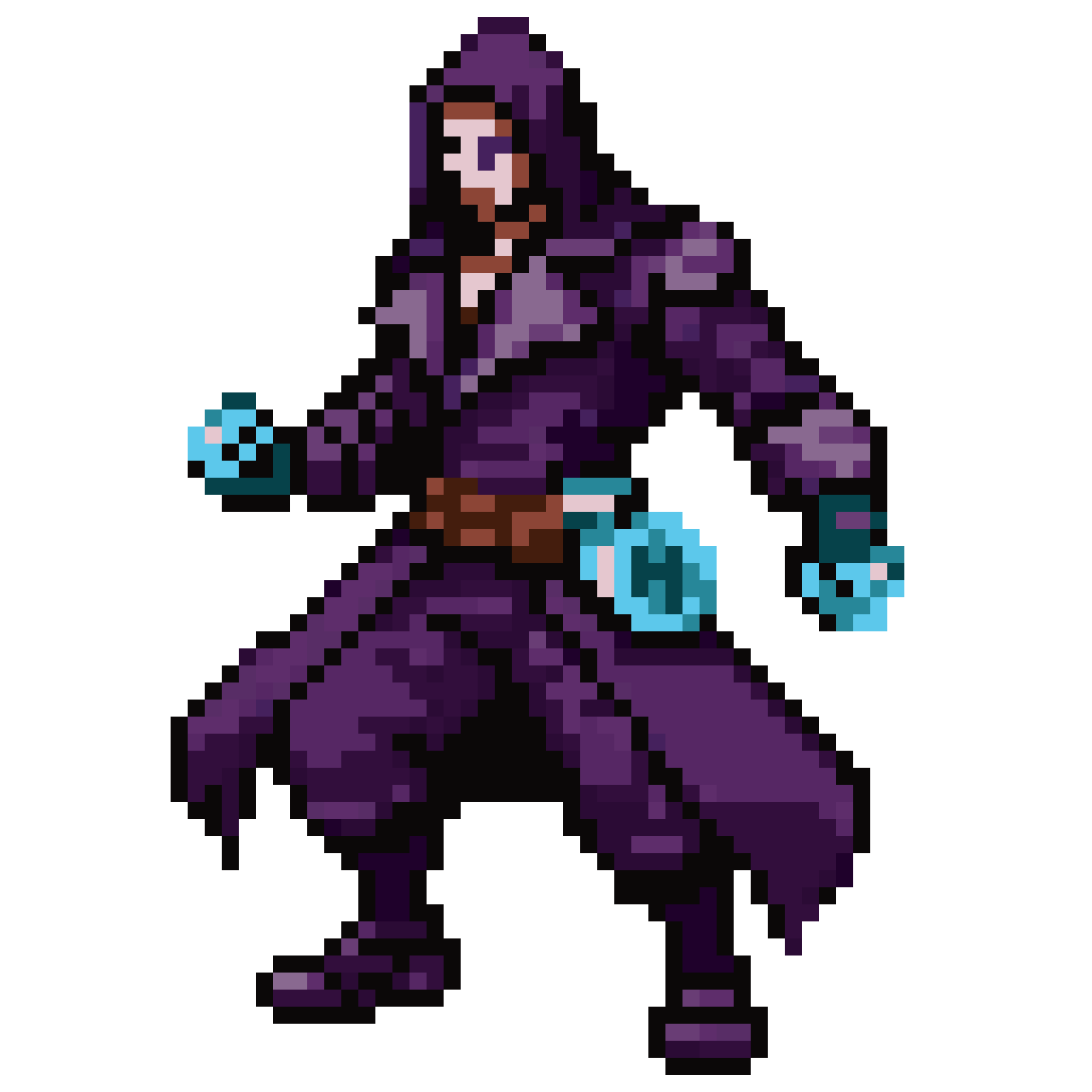 pixel art character sprite, base idle stance. A gritty, vengeance-driven street brawler in a Neo-Noir Alchemical Cyberpu...