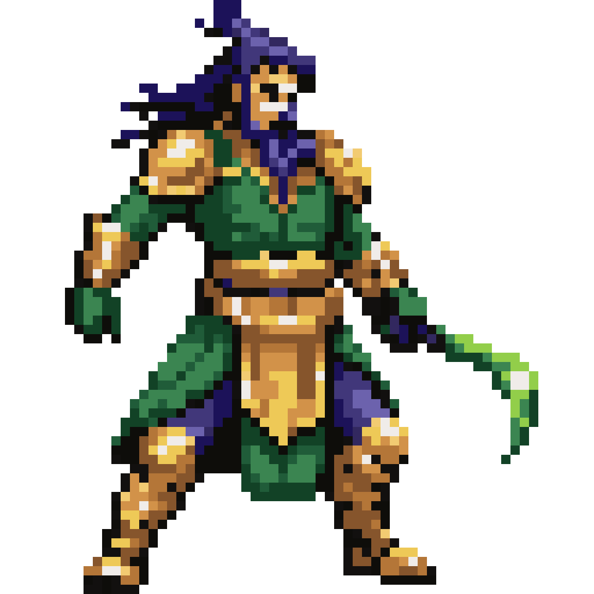 A pixel art portrait of Guan Yu, standing heroically, wearing iconic green robes and a long beard, holding the Green Dra...
