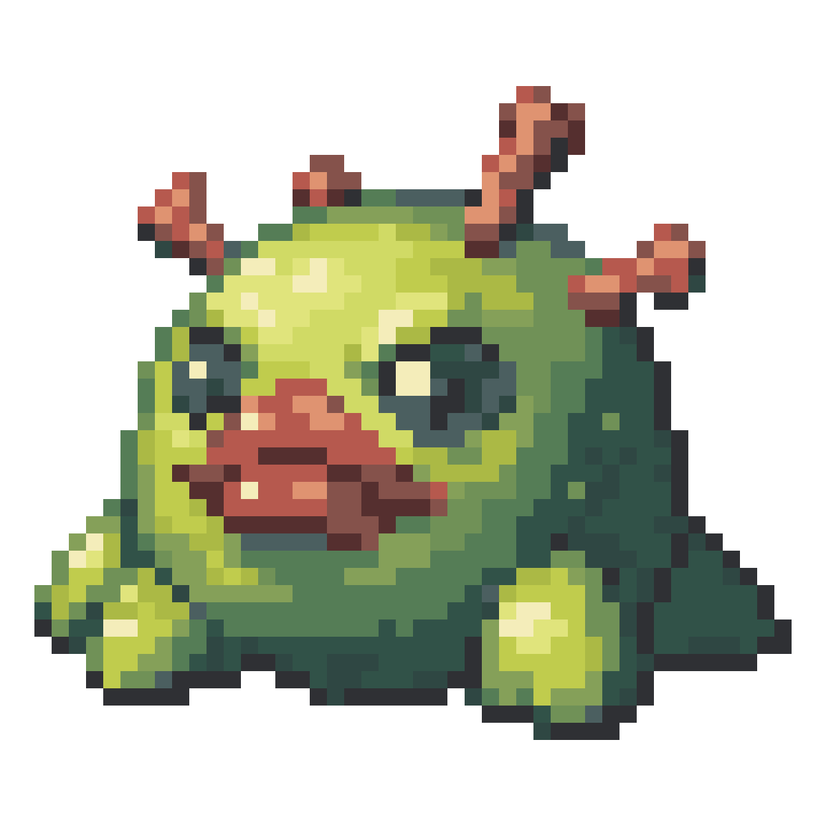 hideous greenish blob monster with four eyes on long stalks on top of it, rough warty skin, and big red kissy lips carto...