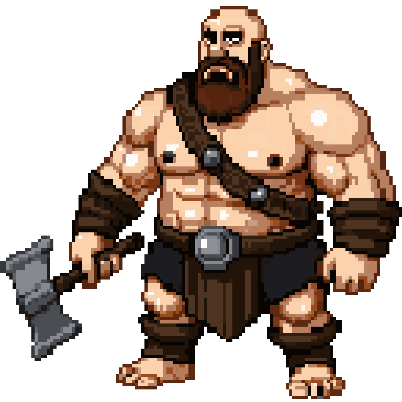 A hulking Viking wearing a loincloth and a shaved head and a braided goatee, side view, high definition pixel art