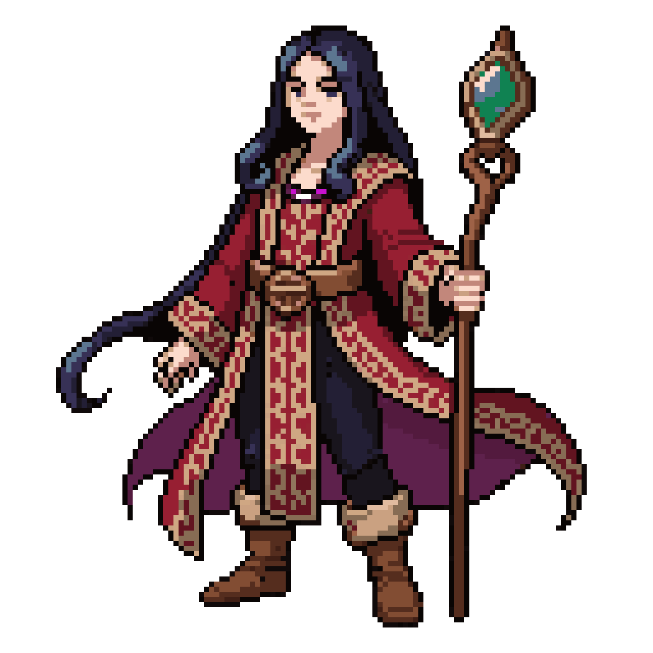 isekai world adventurer, long hair, fancy robe, holdin a stylish wooden staff