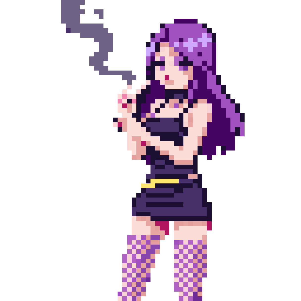 a low pixel lady of the night idling as she smokes a cigarette, she has purple hair and fishnet stockings. It's a sidevi...