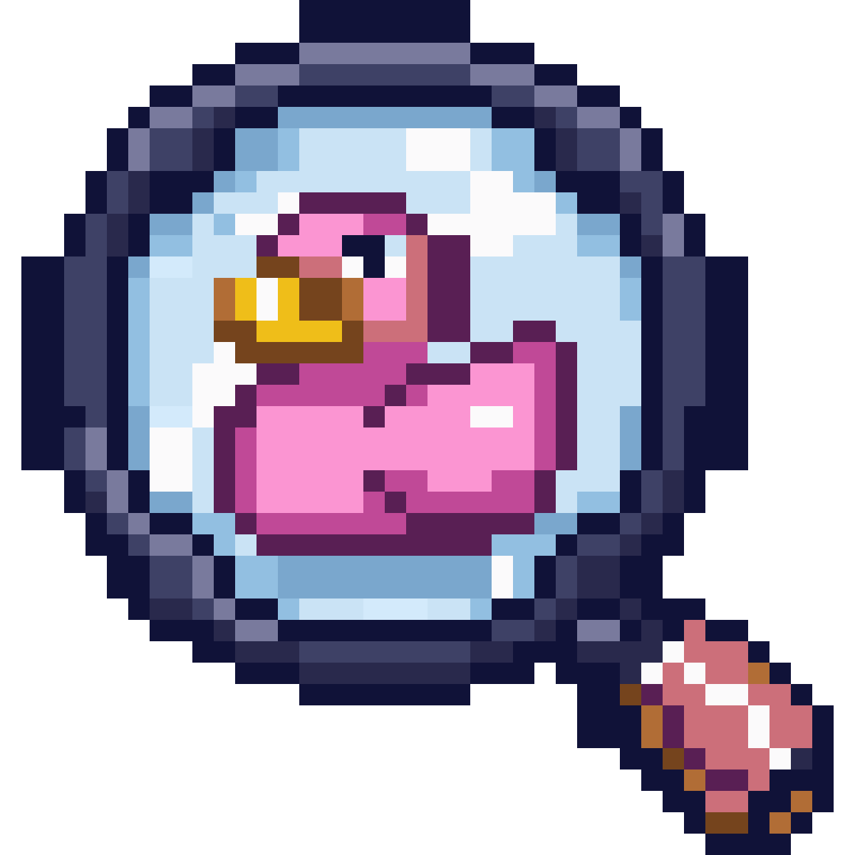 40 x 40 pixel art of a magnifying glass with a habbo pink duck inside it, black px outline