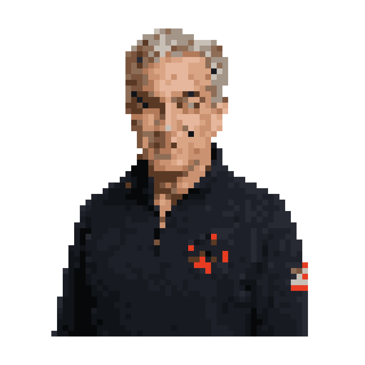 make this personne please : The man has thick, swept-back silver-gray hair and dark eyebrows. His eyes are light-colored...