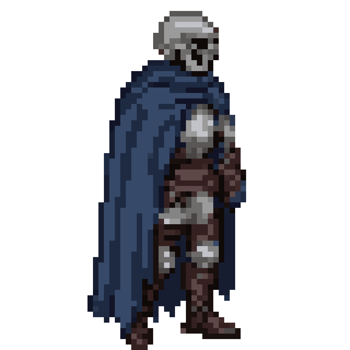 un aventurier médiéval avec une vieille cape bleue cassé, un casque de crâne, un armure cassée