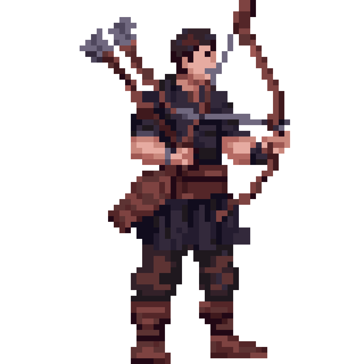 medieval archer wearing black leather clothes and quiver, pretending to hold a bow on his arms, side view, fantasy mobil...