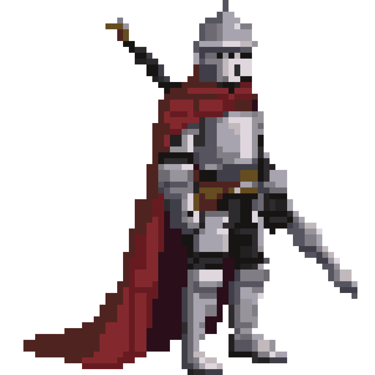 Medieval knight with silver armor,red cape,sword and cape are on his back,side view,style fantasy RPG anime