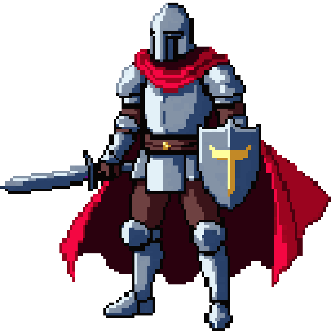 身着银色盔甲、披着红色斗篷、手持剑盾的中世纪骑士,俯视图,奇幻角色扮演游戏风格