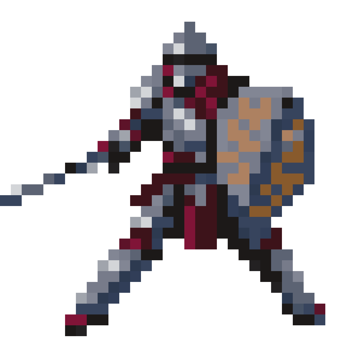 16-bit pixel art, medieval knight in silver full plate armor, holding a longsword and round shield, side view, white bac...