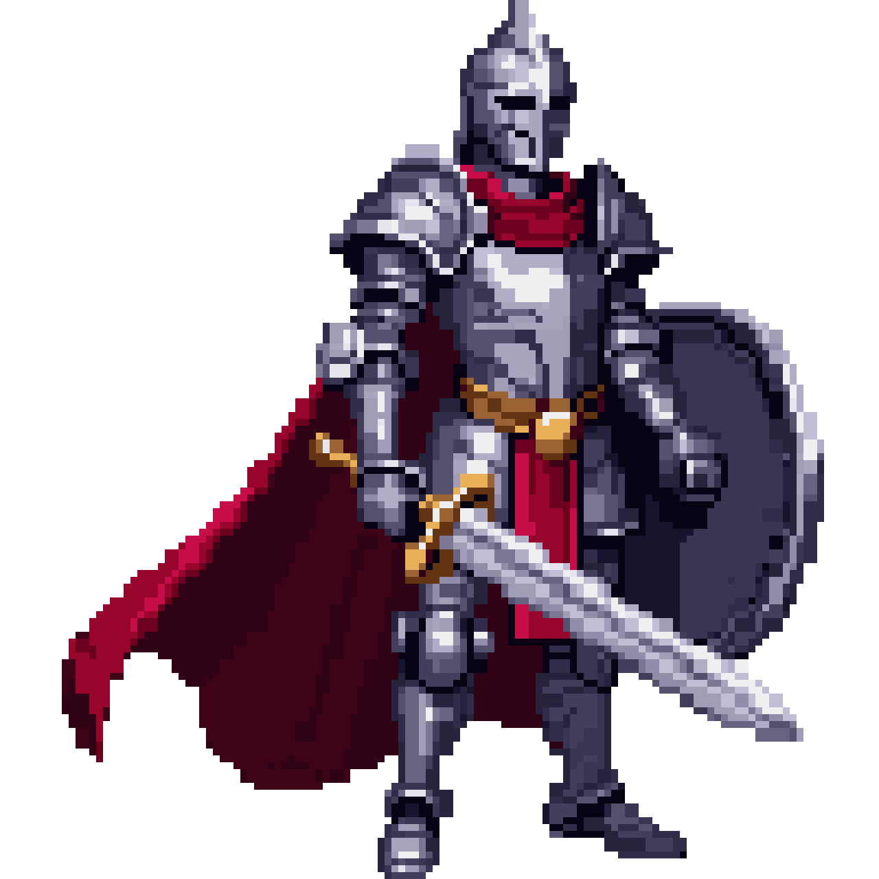 "medieval knight with silver armor, red cape, holding sword and shield, side view, fantasy RPG style" To Top Down
