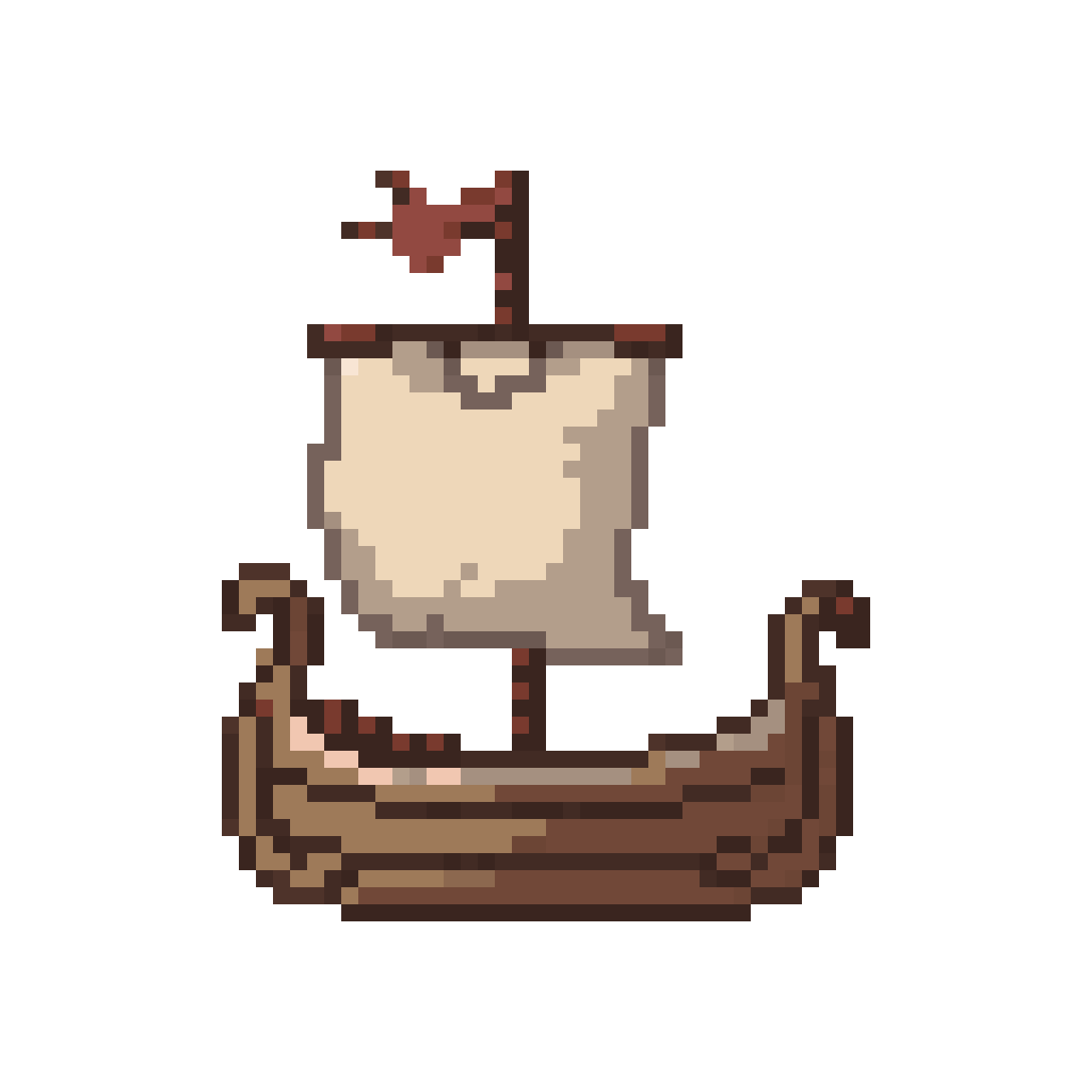 small medieval wooden sailing ship sprite, single mast with square sail, top-down slightly angled isometric view, simple...