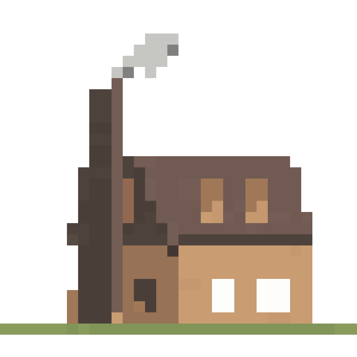 pixel art, 32x32, small factory building, minimalistic, industrial, 1 chimney, smoke, simple shapes, clean palette, game...
