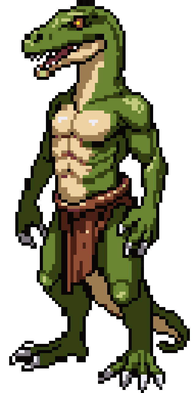 Full body side-profile sprite of a muscular green reptilian dinosaur humanoid, sharp white claws, bared fangs, wearing t...
