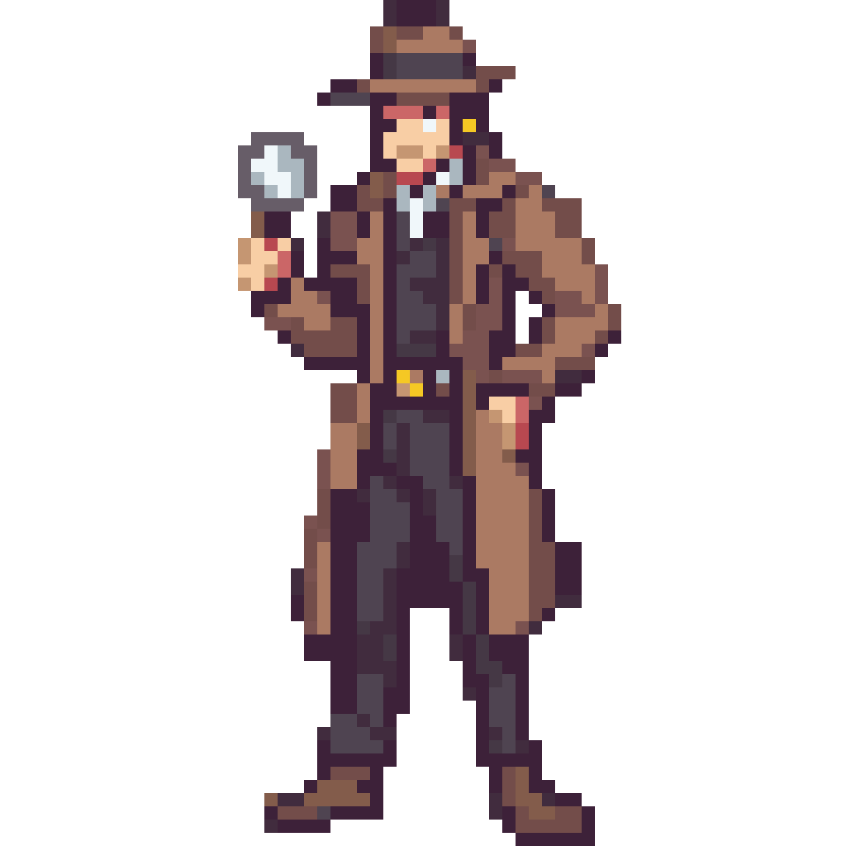 "A single 2D character sprite of a noir detective, full body, standing pose, pixel art style, low resolution, limited co...