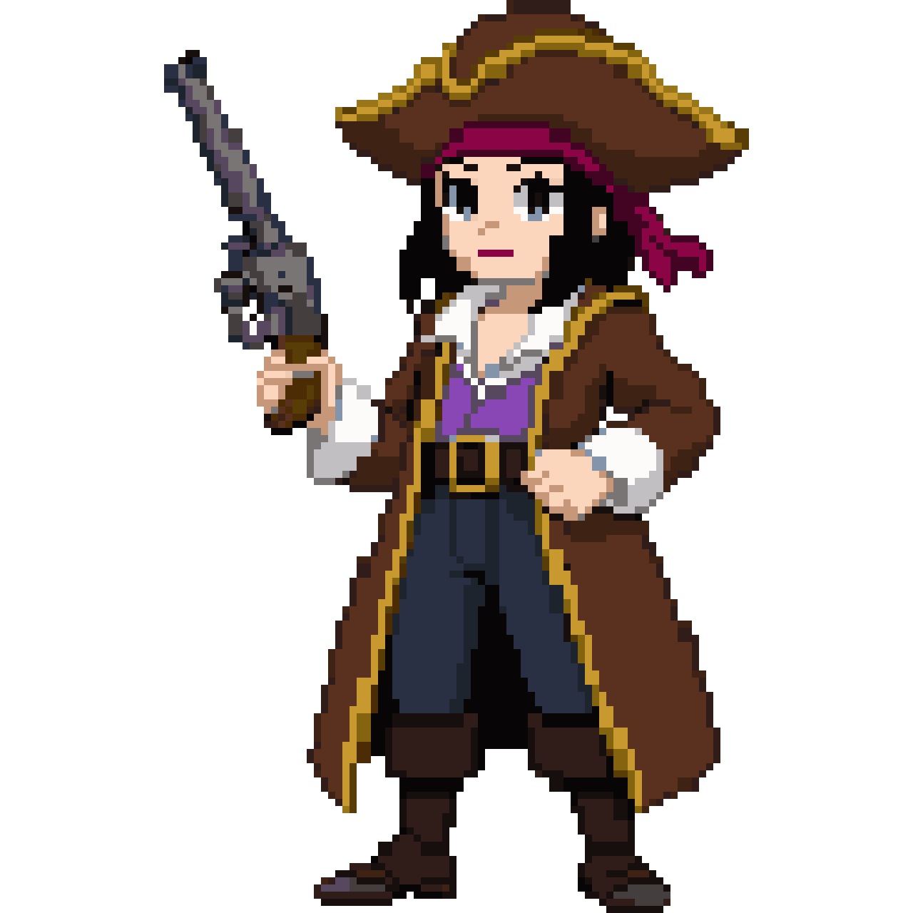 pirate with brown coat , having a pirate hat in his head , holding a 19th century pistol in his arms , high top down vie...
