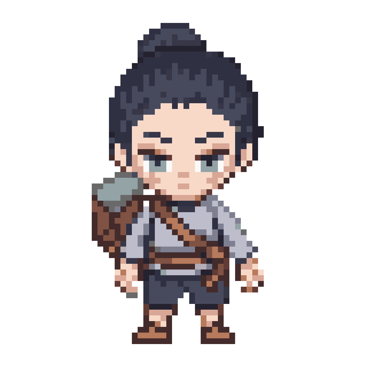 pixel art, chibi 2.5-head-tall, young Chinese male, age 20, thin wiry build, short dark gray hair (#3D3D3D) in simple lo...