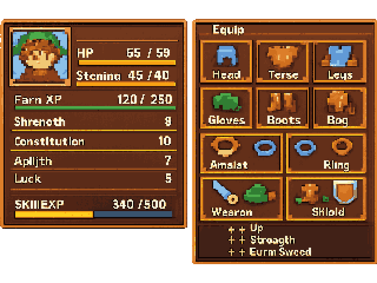 Pixel art user interface for a top‑down RPG and farm game, showing a small character menu with main stats, a skill EXP b...