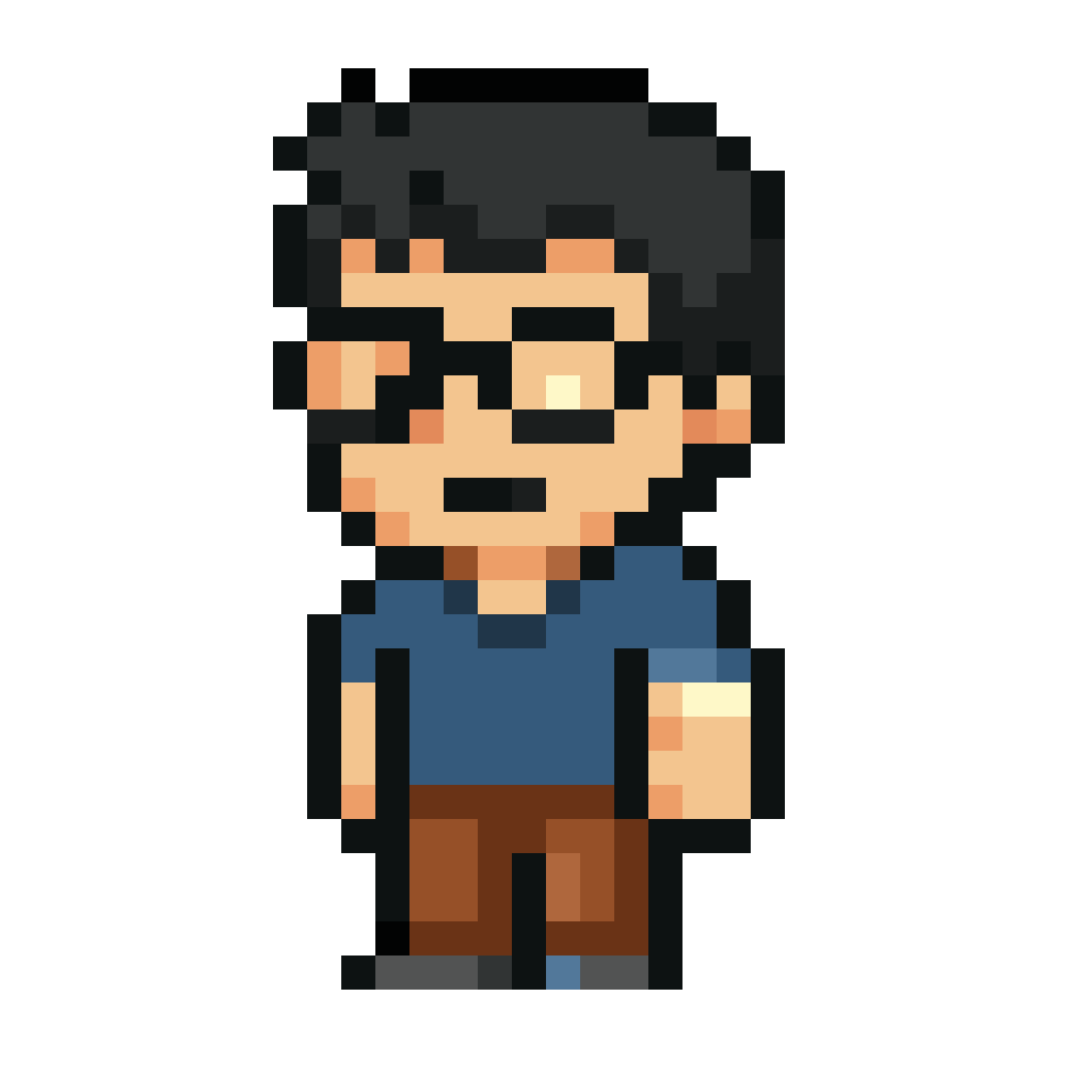 Pixel art sprite of a male character, black hair, wearing glasses, casual outfit, standing pose, 32x32 pixels, clear out...