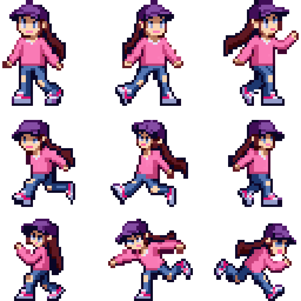 "Pixel art sprite sheet, 32x32, young female character, long ponytail, blue eyes, urban streetwear outfit (oversized hoo...
