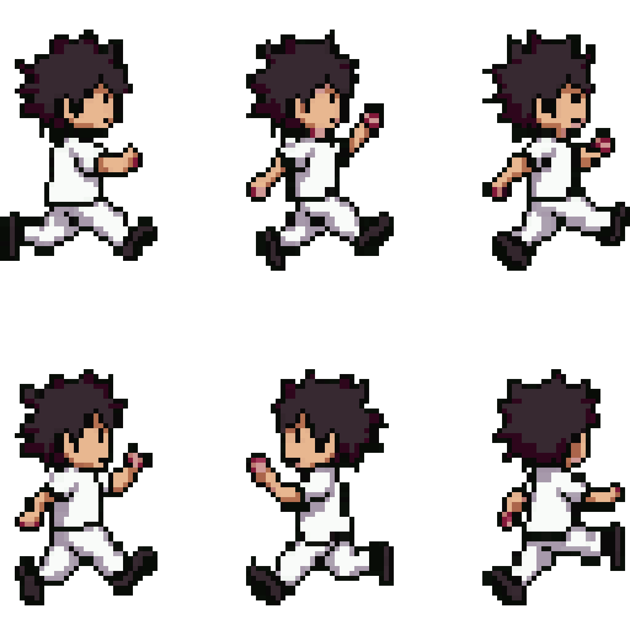 Pixel art sprite sheet. Young teenage boy (13-15 years old), Bolivian, running toward the viewer (south-facing, front v...
